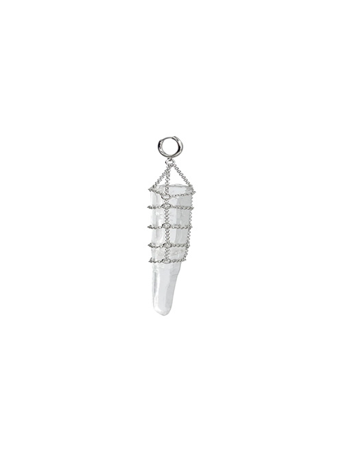 This unique single earring is made with a real quartz gemstone and high quality rhodium plated sterling silver. The stone is a natural shape that makes it one-of-a-kind, and it's caged in a way that makes it look like it's floating.