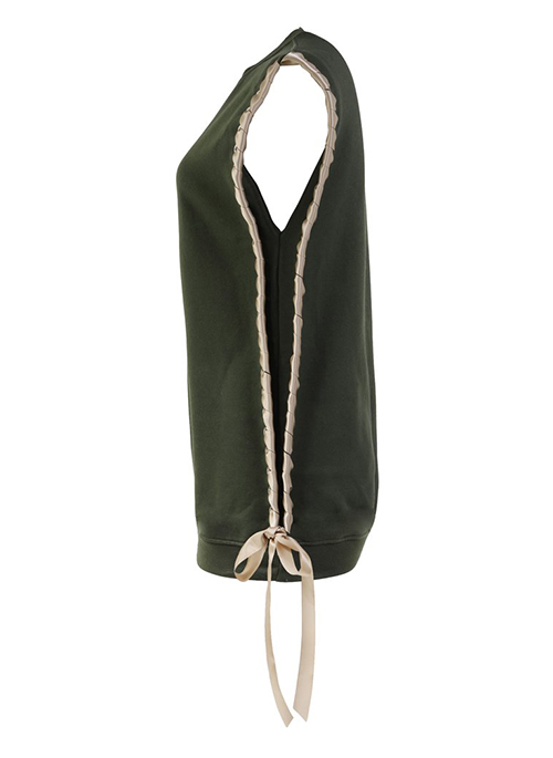 The sleeveless crewneck can be worn solo, or layered over your favorite blouse. With its versatility the outfit combinations are endless. Thanks to the fleece lining comfort isn’t even a question. The natural color palette is complemented with rose gold satin bows, making this the chicest sweatshirt you’ll ever own.