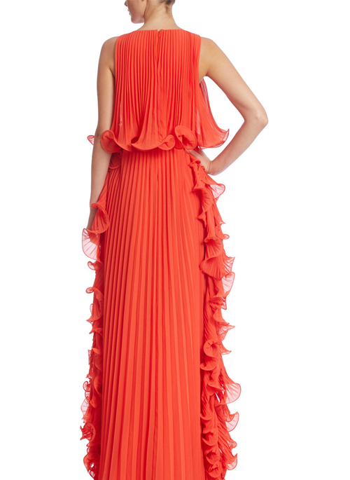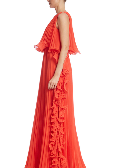 - This gown takes its inspiration from the classic popover style and adds a modern twist with romantic ruffles along the hem and feminine pleats all around. The sleeveless bodice is made of pleated shiny Georgette fabric, giving it a flowing, breezy silhouette that adds even more elegance to this already-stunning gown.