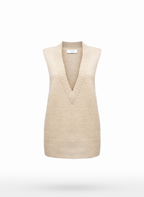 Sleeveless top designed to combine chic and comfort. On a simple shirt or under a jacket, this top will perfectly complete your outfits in a casual chic style. Made of yak wool, it has a plunging V-neckline and wide armholes.