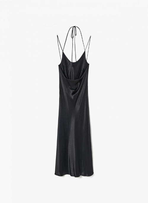 Bias-cut slip dress. V-front shape adjustable spaghetti straps with multiple-detailing tie-fastening. Deep plunge draped open-back.Details: