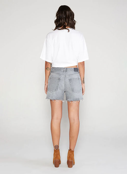 A relaxed fit that sits comfortably at the hip with a tattered hem and a button fly. A cool grey wash adds a touch of softness.