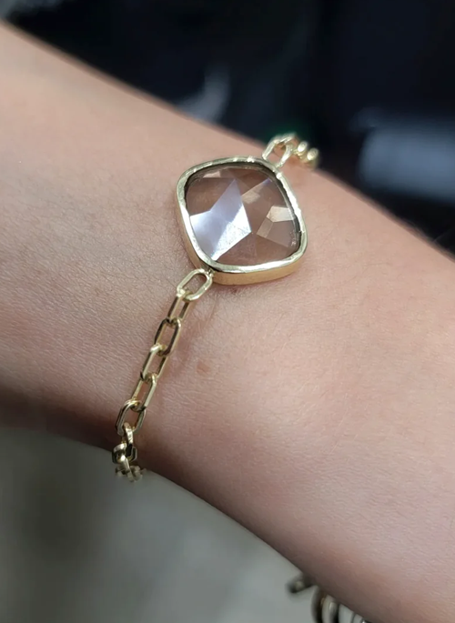 Created in 14k yellow gold with a 4 carat flat facet cut smokey topaz, bezel set.