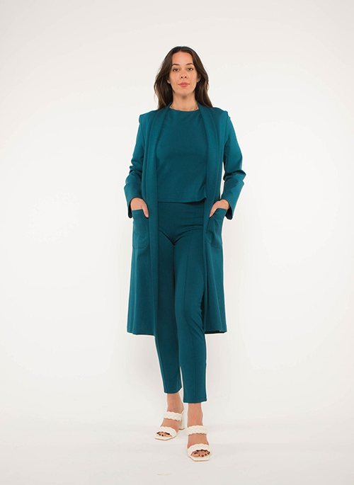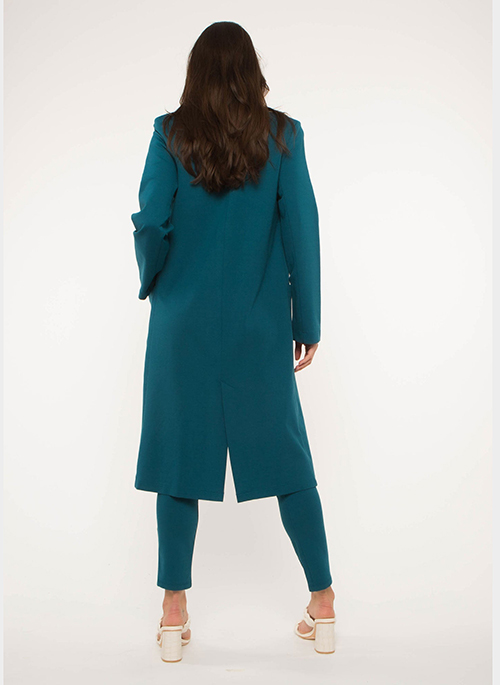 Soft ponte knit fabric creates the structured look but doesnt wrinkle. A modern take of a classic, Turn in your duster for this chic piece.n Self-lined lapels and deep pockets. The perfect piece to pair with our wide or slim leg pant.