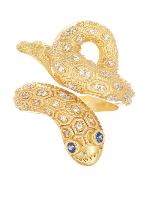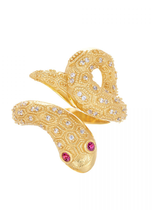 In Hinduism, the coiled snake represents the power of pure desire. Our stunning coiled gold-plate snake is embellished with a multitude of white cubic zirconia, and its eyes are studded with contrasting gemstones of blue, red or green cubic zirconia.