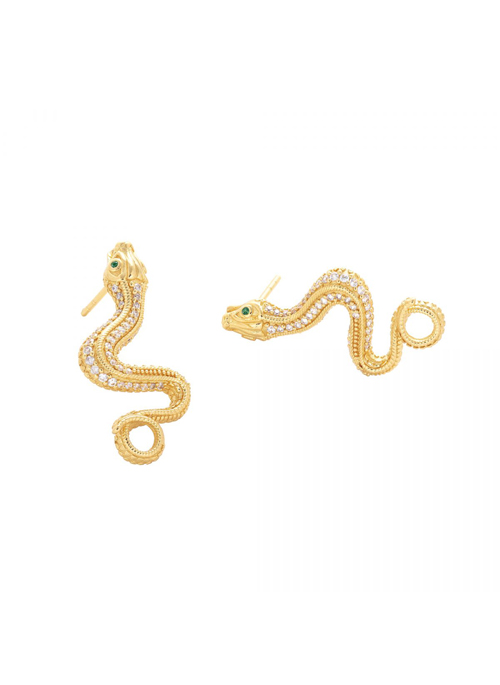 On their own, or matching the Vain Snake Pendant, these earrings are the stuff of legends. The gold-plated snake boasts mesmerising green, red, or blue gemstone eyes, as it coils itself upwards, decorated with miniature, sparkling white zirconias along its length.
