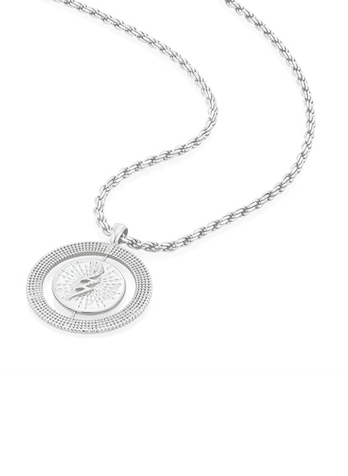 Part of the Snakebolt Collection, symbolizing rebirth and sudden illumination, the spinner necklace features a blazing snakebolt on a spinning coin with a rope chain.