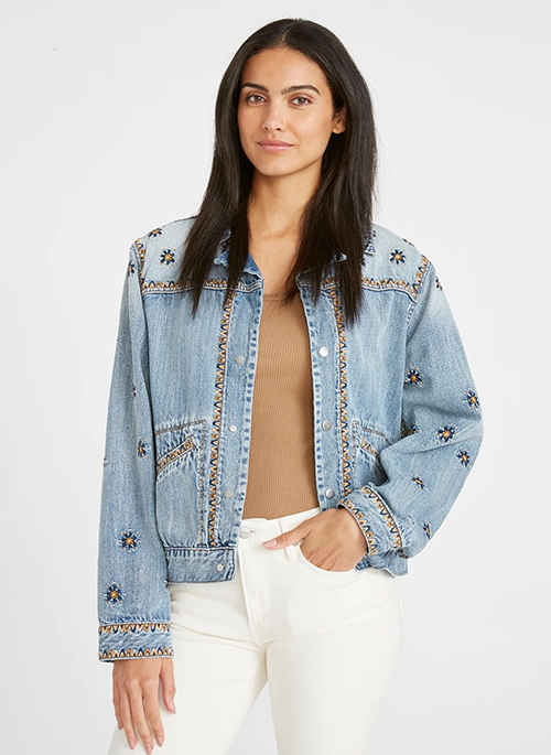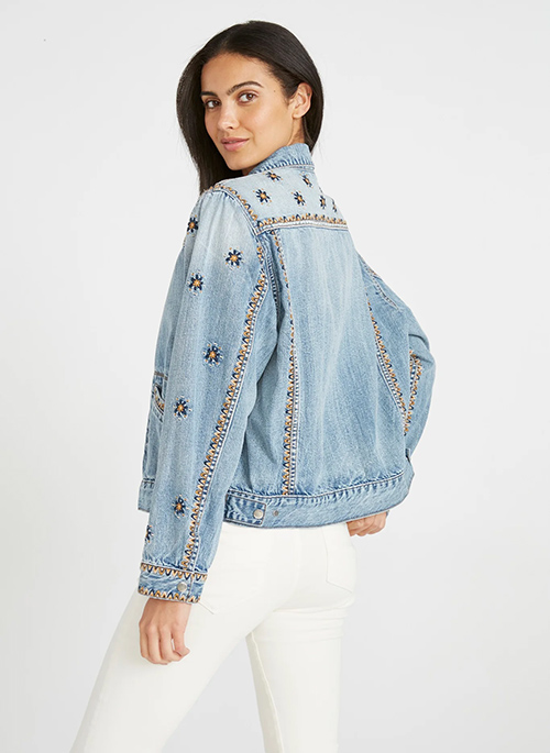 What happens in Vegas, stays in Vegas. This balloon sleeve medium wash denim Snap Jacket features snap closures and embroidered detailing throughout. Let it stand out with your favorite simple Driftwood jeans.Details: