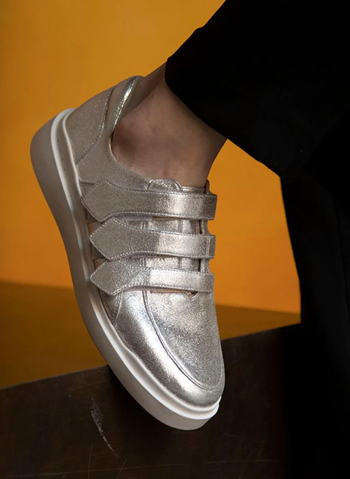 A limited edition design for the Spring Summer 2023 collection. Three velcro straps with an arrow design hold this new urban sneaker perfectly on the foot. Created in luminous metallic skins, which make this shoe a total icon.