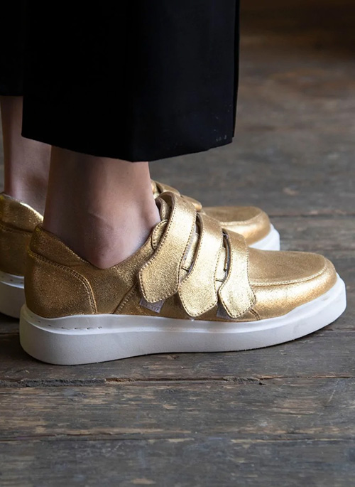 A limited edition design for the Spring Summer 2023 collection. Three velcro straps with an arrow design hold this new urban sneaker perfectly on the foot. Created in luminous metallic skins, which make this shoe a total icon.