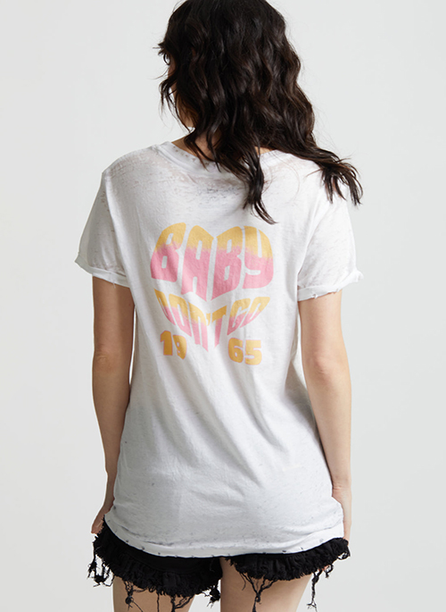 This retro fitted tee features Sonny and Cher aka the duo known to be Caesar and Cleo on the front, and their hit song, “Baby Don’t Go” in detailed lettering on the back. This song written by Sonny himself was one of their first major hits that got them on the Billboard Hot 100 in 1965. This fitted lightweight tee is made with soft washed down fabric, cuffed short sleeves, distressed hems, and a ribbed crew neckline.