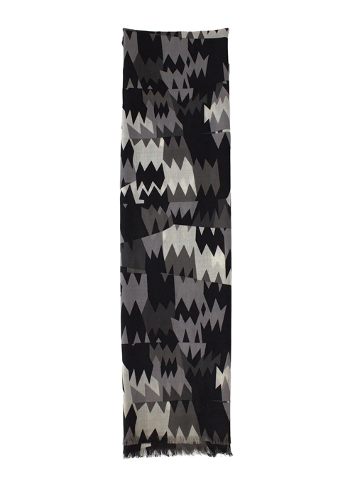 Black, grey, and white patterned design printed on 100% wool scarf. This wool is a lightweight and seasonless fabric and the scarf is adorned with eyelash fringing at the edges.