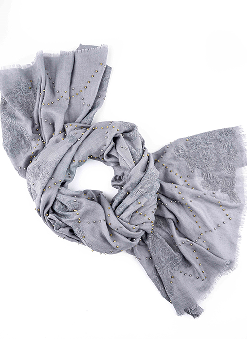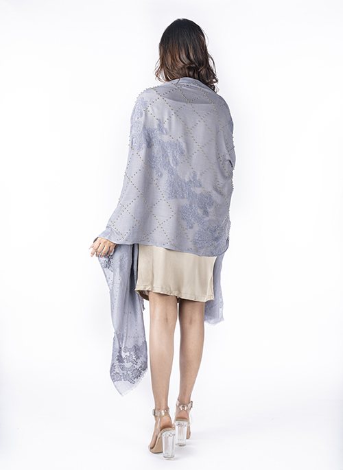 A silk and wool blended scarf embellished with a trellised pattern of metallic pearls intertwined with floral lace cutouts.