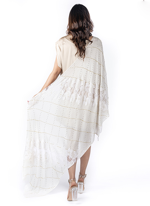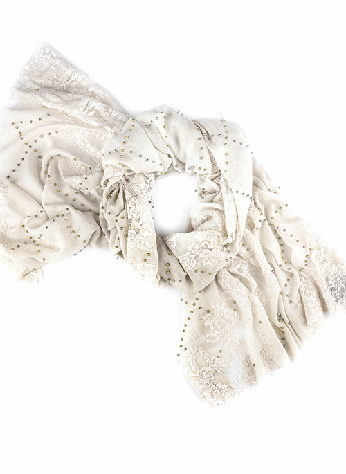 A silk and wool blended scarf embellished with a trellised pattern of metallic pearls.