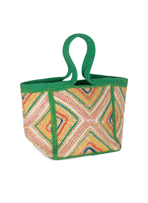 Designed for the fabulous gal on the go, this fabulous tote bag is the ultimate statement-making carryall! Constructed of heavyweight woven and braided cotton metallic trim, this duffel bag has a colorful, all-over geometric pattern.