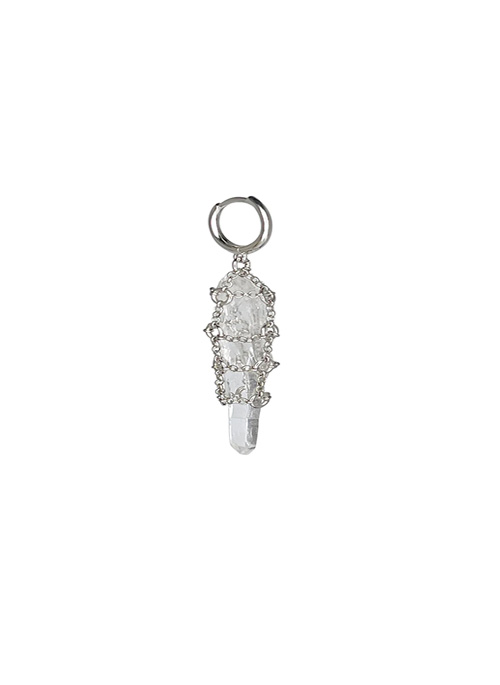 This unique single earring is made with a real quartz gemstone and high quality rhodium plated sterling silver. The stone is a natural shape that makes it one-of-a-kind, and it's caged in a way that makes it look like it's floating.