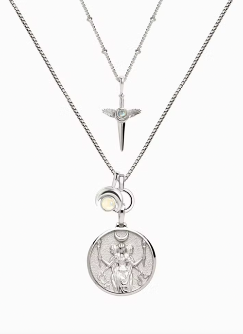 - Rebirth, new beginnings, and life after death are affirmed in this potent necklace set that sees Goddess of witchcraft Hecate use the powers of the rejuvenating Inverted Moon Amulet and the strengthening Flying Dagger Amulet to enhance her magic. She uses these amulets to demonstrate the significance of life’s cyclical nature while also leading souls toward their rightful paths and blocking negative energy.