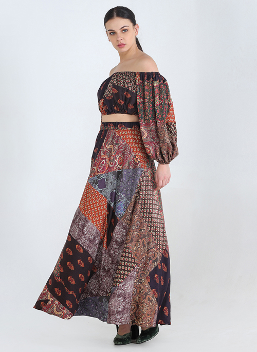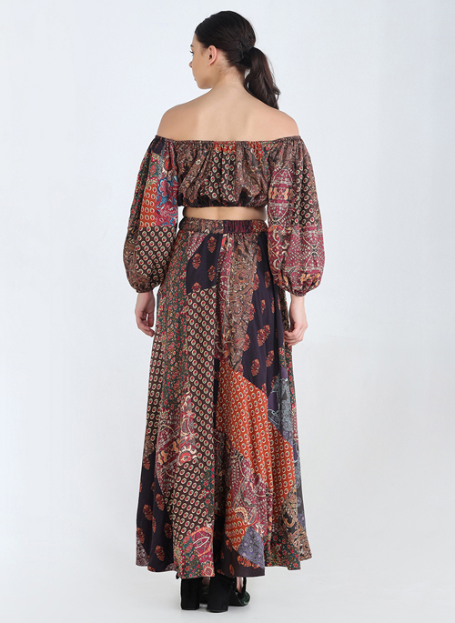 Off Shoulder Gathered Spliced Blouse Multicolor Muslin