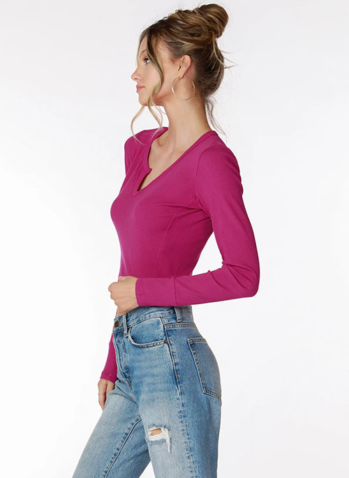 Raw edge details at the deep V split neck and princess seams give this tee an edgy vibe. This rib fabric shapes this tee with a fitted cropped silhouette and long sleeves.