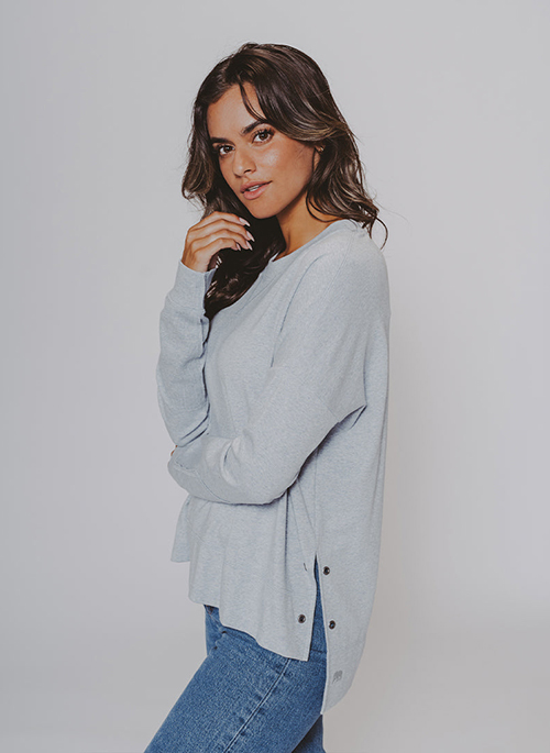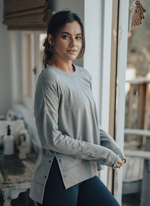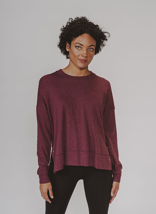 This Puremeso silhouette is a no-brainer and can virtually be worn with anything, whether you're gearing up in our leggings for a hike or you want to dress it up for the office with a skinny jean and a bootie. Style features hi-low split side hem with snap details and sleeve panels.