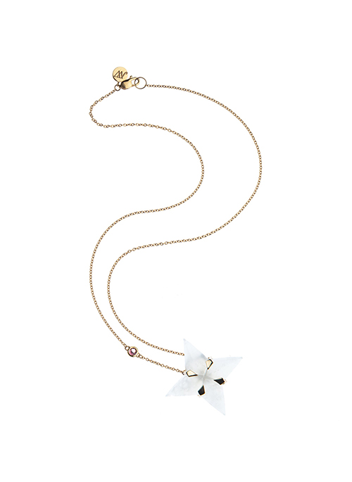 Our newest carved stone to layer onto your neckmess, this necklace features a stunning carved white moonstone star pendant set in 10k gold and accented with our favorite pink tourmaline detail. Perfect to wear alone or to layer above a coin pendant.
