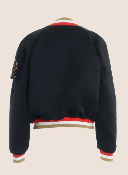 Black duchesse bomber jacket with raglan sleeves, front pockets and ribbed knit edges. Characterized by a sequin patch pocket with gold and black animalier motif on the left sleeve and an exposed zip on the right sleeve. The closure is front zip. Head designed and made entirely in Italy.