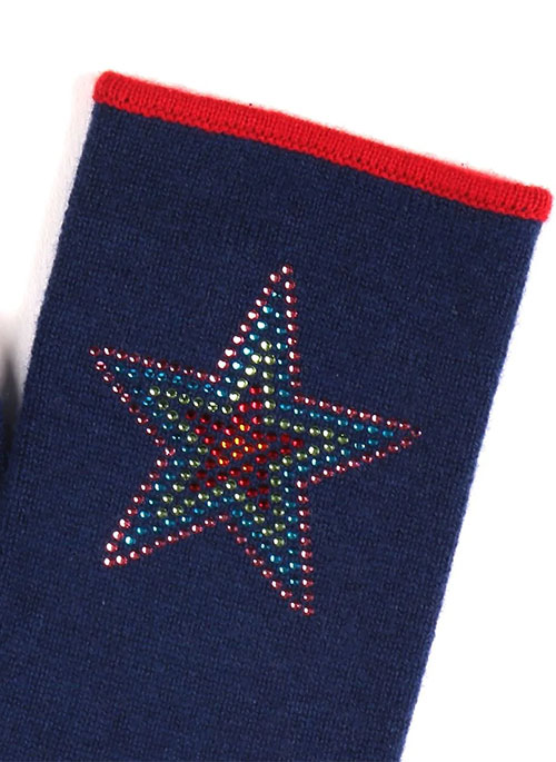 Fingerless mittens with stripped hem, contrast colour tipping and crystals.