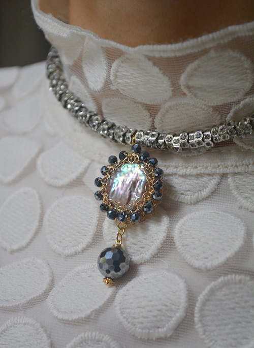 Interpretation of moonlight vintage Swarovski diamante beads necklace centred artfully crocheted 14K recycled gold-filled wire and playfully strung dozen of mini faceted natural Terahertz stones around a lustrous iridescent purple Baroque Freshwater Pearl. Terahertz stone represents the ‘Radiation of Life’. It has understated elegance, and marries well with any occasion and outfit.