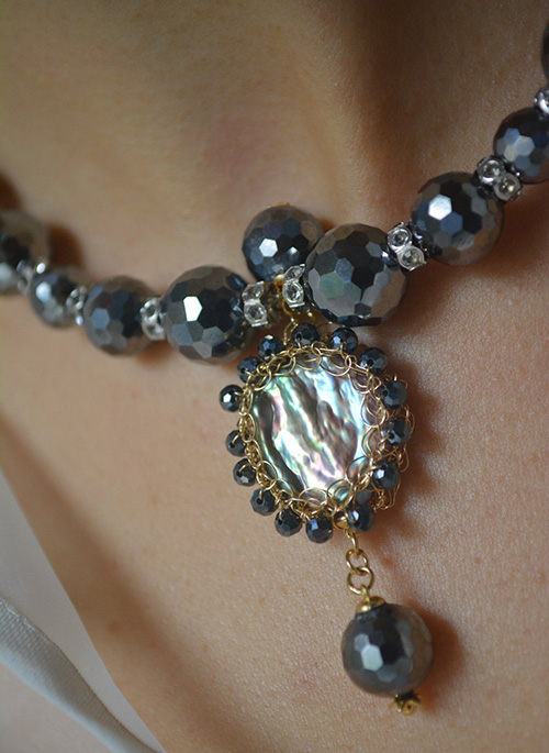 Interpretation of moonlight with faceted Terahertz, vintage Swarovski beads and centred with a deep iridescent purple freshwater pearl, constructed artfully with crocheted 14K recycled gold-filled wire and playfully strung dozen of mini facted Terahertz stones. Terahertz stone represents the ‘Radiation of Life’. It has understated elegance, and marries well with any occasion and outfit.