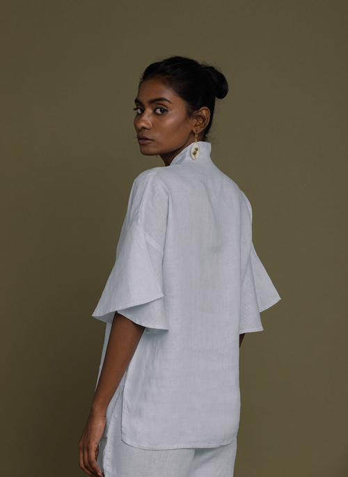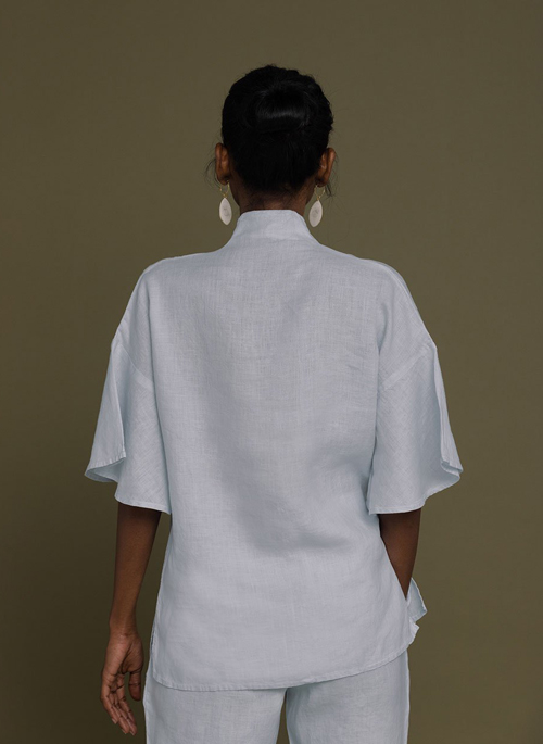 Raised at the back and a narrow V-neck in front, this breezy top has chic ruffle sleeves for added flair. Keep it casual or add a belt for a fitted look!