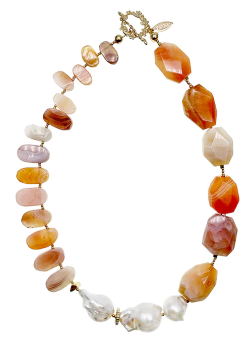This handmade necklace is made of orange agate with baroque and Japan golden plated brass findings. It was inspired by nature with beautiful color combination. Pair with Farra earrings and bracelet to complete your look from day to night for any occasion. Also, this is a very nice gift for birthday, anniversaries or festivals. It will be contained in a nice jewelry box with well packed.