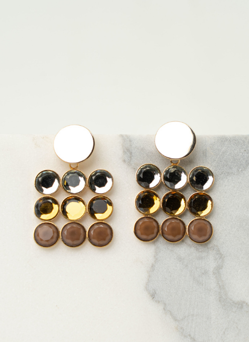 With the Stella drop earrings, you’ll radiate true authenticity. Its three rows of glamorous glass stone, held by a gold plated statement stud, make a distinctive, yet fascinating look. There’s a color mix for your every mood, allowing you to express who you really are. No matter the outfit, Stella makes an impact.