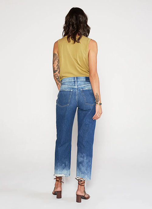 A straight leg jean with a high rise and vintage construction finished with thoughtful destruction and dimensional eco wash technique.