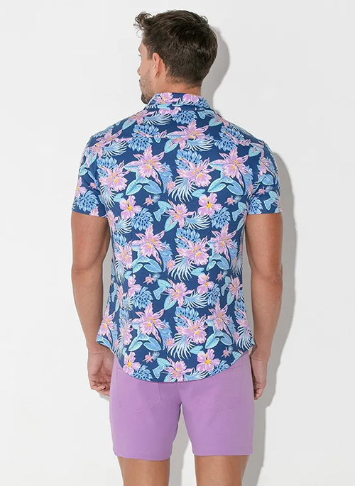 Semi-fitted short-sleeved T-shirt made with elastic technology. Featuring a shirt collar and button front closure and iconic high frequency logo to the chest.Details: