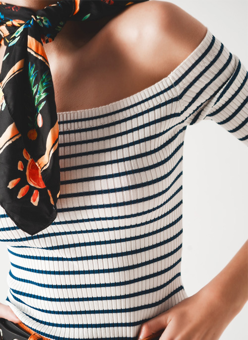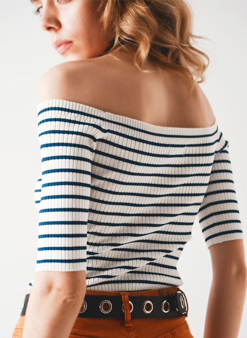 NEW STRIPE BARDOT TOP IN NAVY Details: 55% Viscose 45% Polyamide. Model is wearing size S. Model is: 33-23-35 Height: 5'10''. Runs true to size. Bodycon Fit. Style Nº: 5281017.