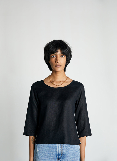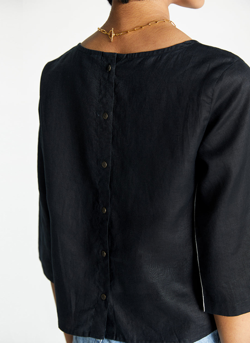With button detailing at the back and and a color blocked stripe down the side, this is a great shirt to have in your closet.