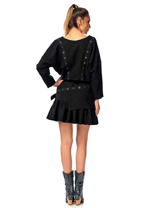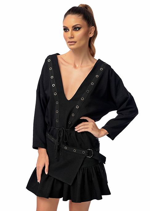 The versatile midi-dress accentuates femininity with the relaxed cut and studs’ details on the front. You can wear it for a party with high heels and an elegant long jacket. Or you can accessorize with a cool baker boy hat and boots to rock your day!