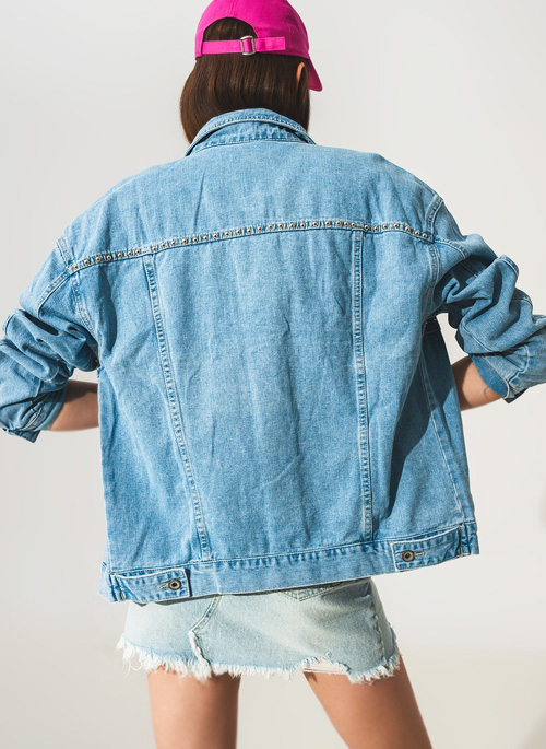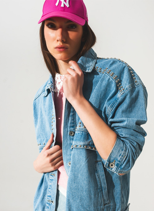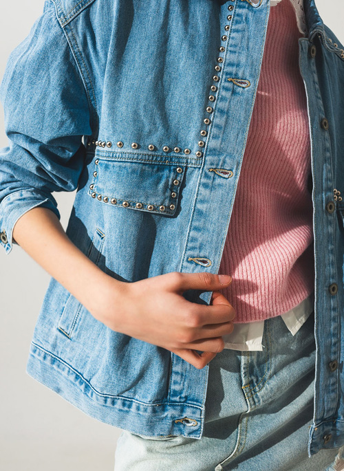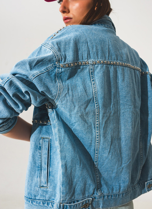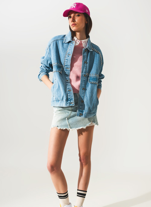 NEW STUDDED GRANDPA UTILITY DENIM JACKET IN MID WASH Details: 100% Cotton. Model is wearing size S. Model is: 33-25-36 Height: 5'11. Runs true to size. Oversize. Style Nº: 1309908.