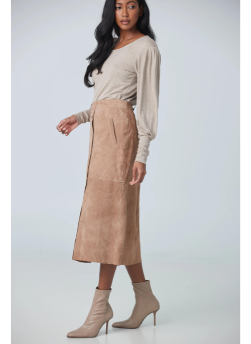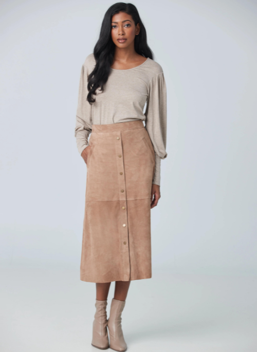 This suede midi skirt with pockets and buttons in the front will be perfect for a sophisticated and original look. Wear it with a turtleneck or a shirt and you will get a chic and elegant ensemble.