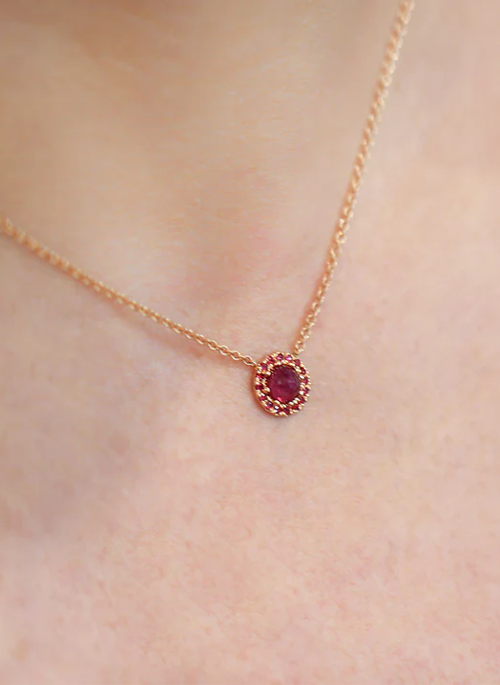 A beautiful upside down 1.03ct round cut ruby set around a halo of 0.18ctw rubies is nestled in 14k yellow gold. Also available in rose or black gold.
