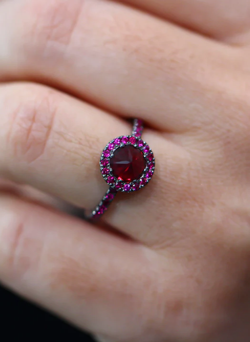 14kt Black Gold Created with Round cut 6.5mm Ruby with matching halo.