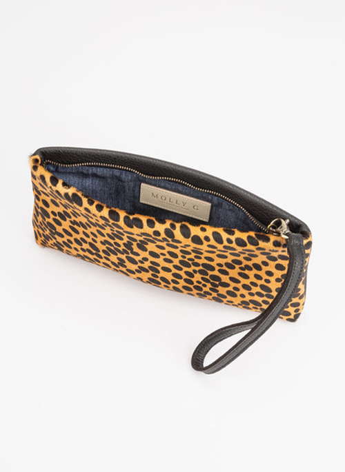 Meet Suki, our small but sassy wristlet in cheetah. Our cheetah pattern is printed on luxurious calf hair hide. Fit your essentials in her perfectly crafted frame for a hands free night out! She is lined in chambray and features the perfect removable wrist strap for comfortable wear. Suki is the ultimate must have in every girls wardrobe!