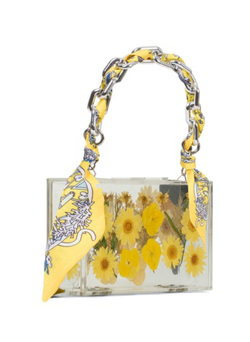 This super happy, fun clutch is a fabulous piece for your next sunny day outing! Made with vibrant dried yellow flowers encased in clear hard plastic, this rectangular clutch purse brings the peace and good vibes with you everywhere you go! The bottom has a hinge opening and the top snaps closed with a magnetic clasp. The chain handle on top is interwoven with a fabulous and colorful removable scarf. This beautiful clutch radiates positivity and is sure to earn endless compliments!