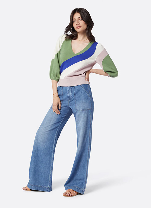 A lively lightweight sweater with a romantic charm thanks to its voluminous sleeves and deep V-neckline. The Sunland is a new way of wearing summer knits with comfort and style.