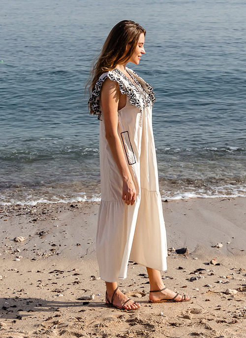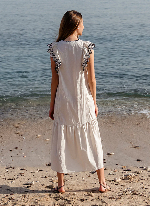 Let’s talk about contrast placement embroideries! This midi dress is versatile for every-day wear but also for special summer occasions. Beautiful placement eyelet embroidery adorn ruffles, neckline and also around the side pockets. This midi dress shape is timeless and has a soft tier adding to a feminine look. The neckline is open and has a self-fabric lacing detail. Together all these design elements create an easy to wear piece, suitable for different summer occasions.