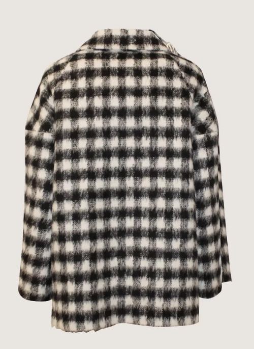 Short coat in black and white check wool with wide lapel collar. Characterized by the single-breasted two-button placket, the two front patch pockets and the detail, designed and made by hand, of brooches and patch application. Head designed and made entirely in Italy.