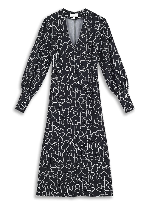A fitted dress with buttoned front and tie back belt with deep cuffs. Made from planet friendly Oeko-tex poly which has a slight stretch.