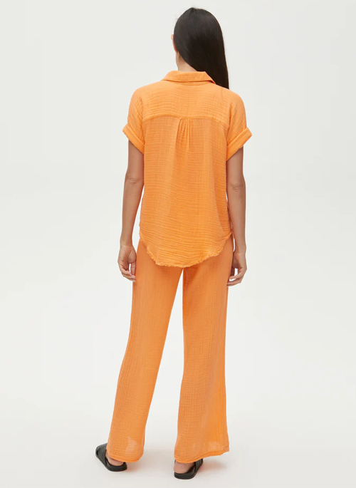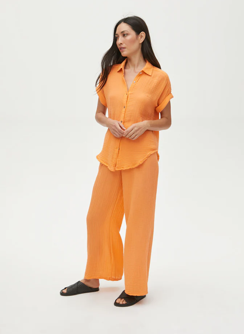 In lightweight 100% cotton, these smocked double gauze pants feature a comfortable elastic waist band and a wide leg silhouette that looks fresh for your warm weather casual style.