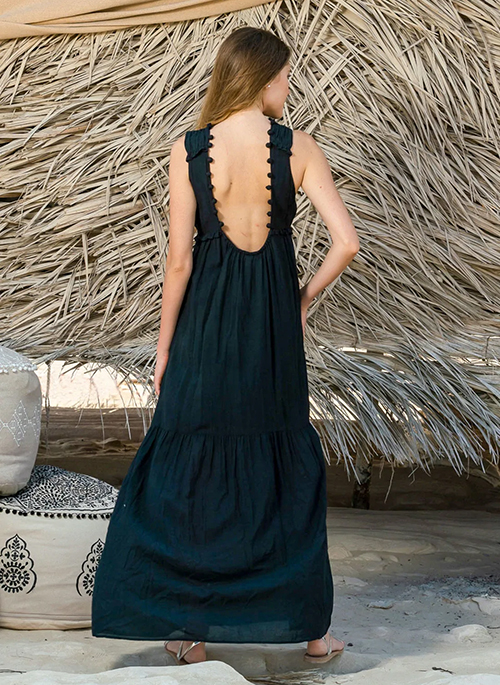 One can never go wrong with a sleeveless maxi dress, in solid colors and with feminine details. SWEETEST DREAMS have an elegant empire cut giving you an elongated look when wearing it. The bust area has pleating and the scooped back is framed by hand embellished pom-poms, as is the front neckline. This stunner is cut from a blended cotton viscose georgette and it comes in three eternal colors, made to last far beyond just one season.