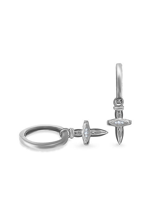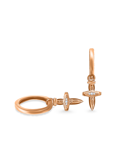 Sparkle like no one else with the Earrings Diamond Sword. These stunning earrings are designed with 18K full gold hoops and a hanging of sword shape encrusted with sparkling white diamonds. They can be purchased in rose, yellow, or white gold.